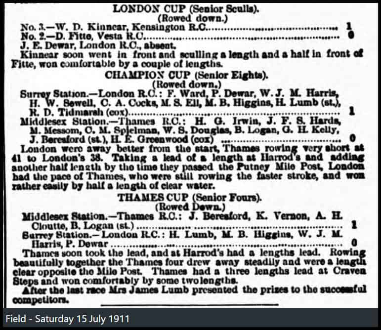 In the most important race of the day, the Champion Cup for Eights, London scored a somewhat easy victory over Thames, thus avenging their defeat of last year. London rowed the same crew as they entered for the Grand at Henley — Ward at bow, Dewar, Harris, Sewell, Cocks, Ell, Higgins, the old Oxford oar, and Lumb, their captain, at stroke, with Tidmarsh coxswain. Thames had strengthened their Henley crew by the introduction of Beresford at stroke, and Bruce Logan at 6. Irwin was at 7, Douglas at 5, whilst Spielman, Hards, Thompson, and Messom completed the crew in the bows. Both crews started well, but after two or three strokes London went up so fast that at Harrods they were a length ahead, and soon after were well clear. In spite of Beresford's repeated spurts they kept their lead all the way, and, rowing comfortably and at a much slower stroke, won by a length and a half in 7.27.